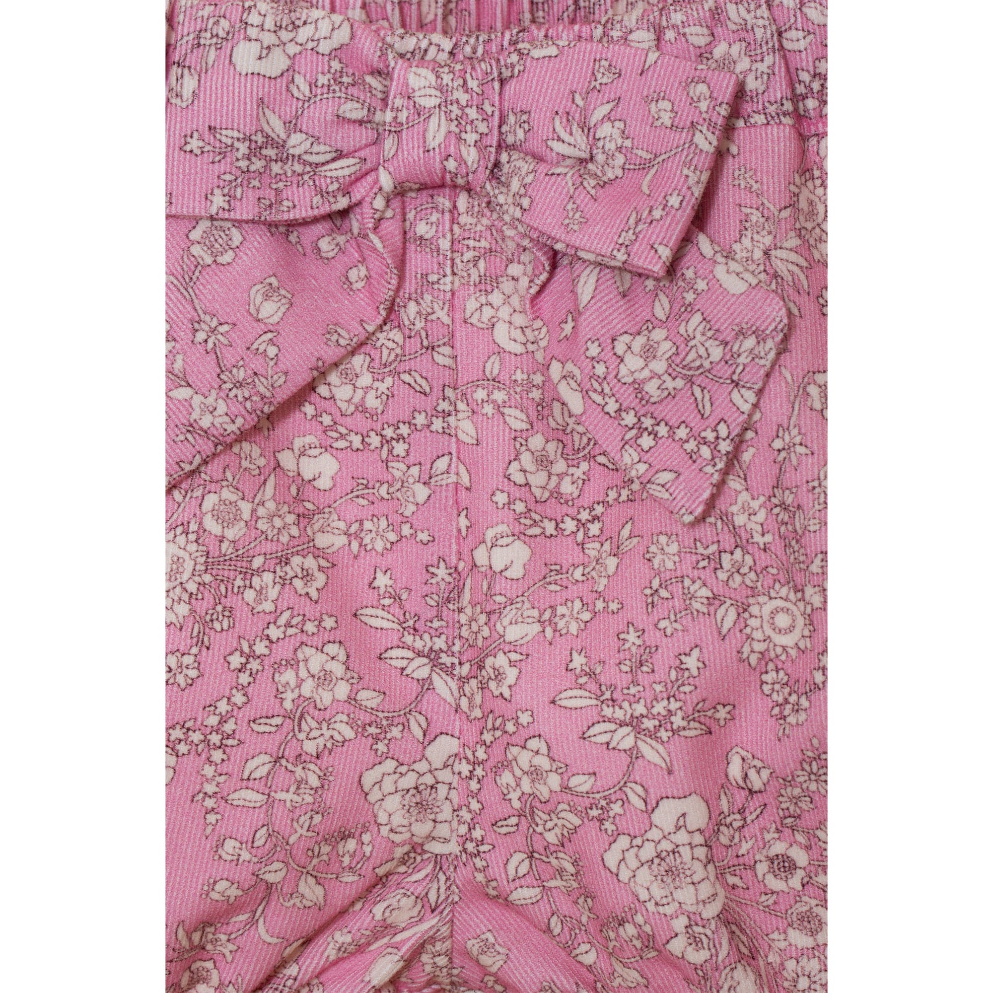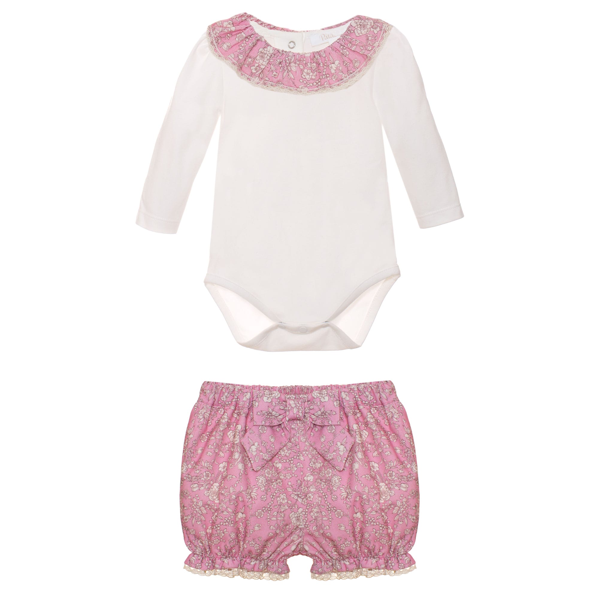 Amazing white body and pink shorts set, crafted from soft jersey and micro-corduroy, this ensemble offers a perfect blend of softness and durability. The charming floral Liberty print on the shorts is echoed in the frilly collar of the body, creating a harmonious look. A sweet bow adorning the shorts' waist adds the finishing touch to this delightful set.
