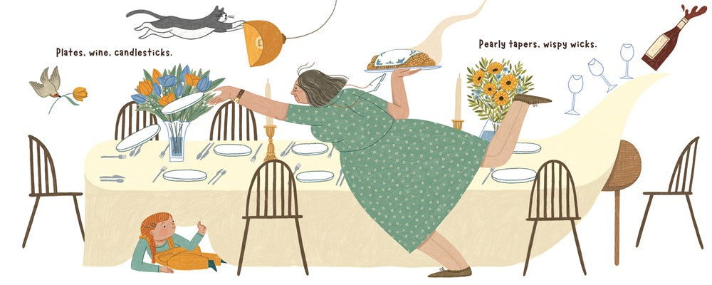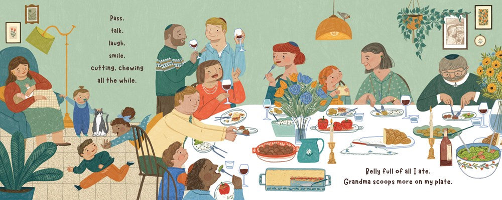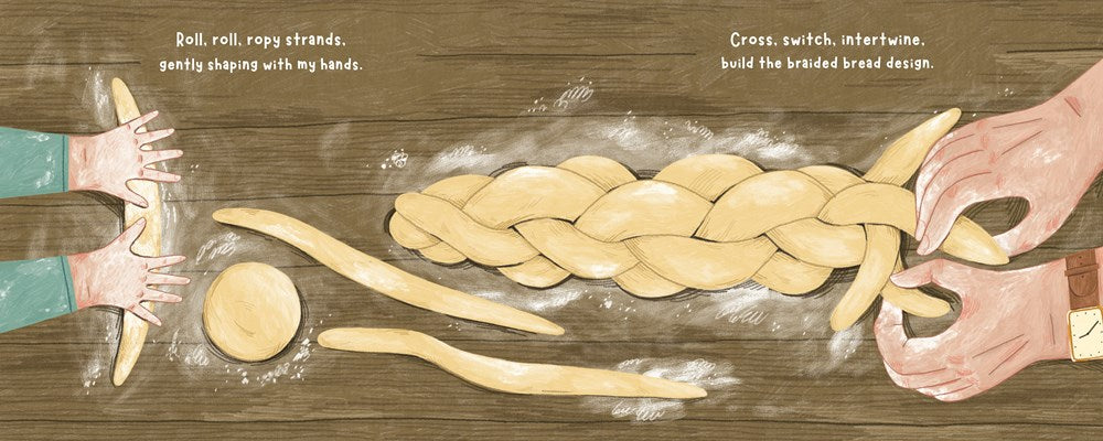 In hours full of laughter and love, they mix the ingredients, braid the dough, let it rise, and set the table, and finally, enjoy a scrumptious family dinner and the bread they made together.