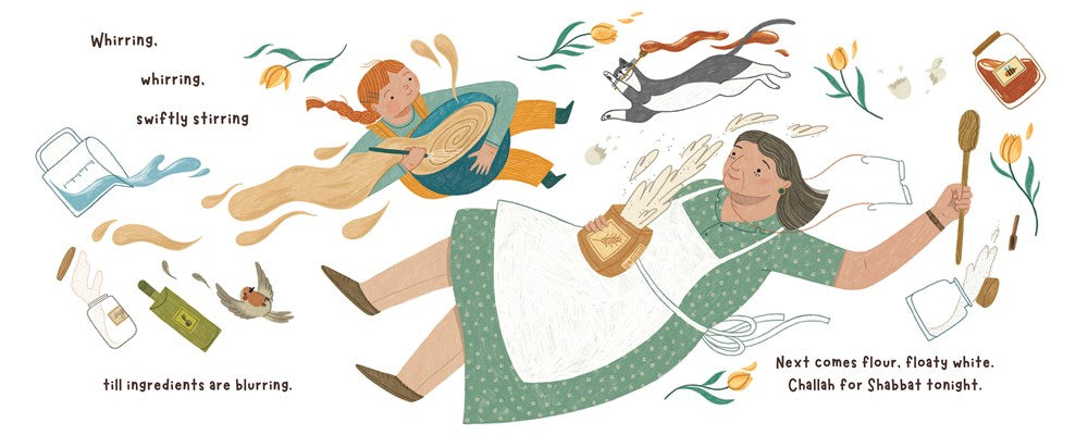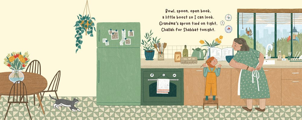 This sweet, rhyming, beautifully illustrated picture book celebrates Jewish joy and intergenerational love as it follows a girl and her grandmother preparing for Shabbat dinner by baking traditional challah from scratch.