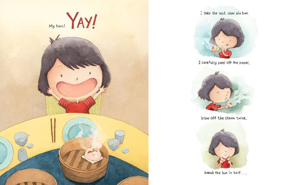 Today is Sunday, and that means its dim sum time with my whole family! I can’t wait to see everyone, especially Grandma. I’m going to eat lots of shrimp dumplings, rice noodle rolls, egg tarts, and my favorite—char siu buns. We will have to order enough for us all to share. So what are you waiting for? Dim sum, here we come!