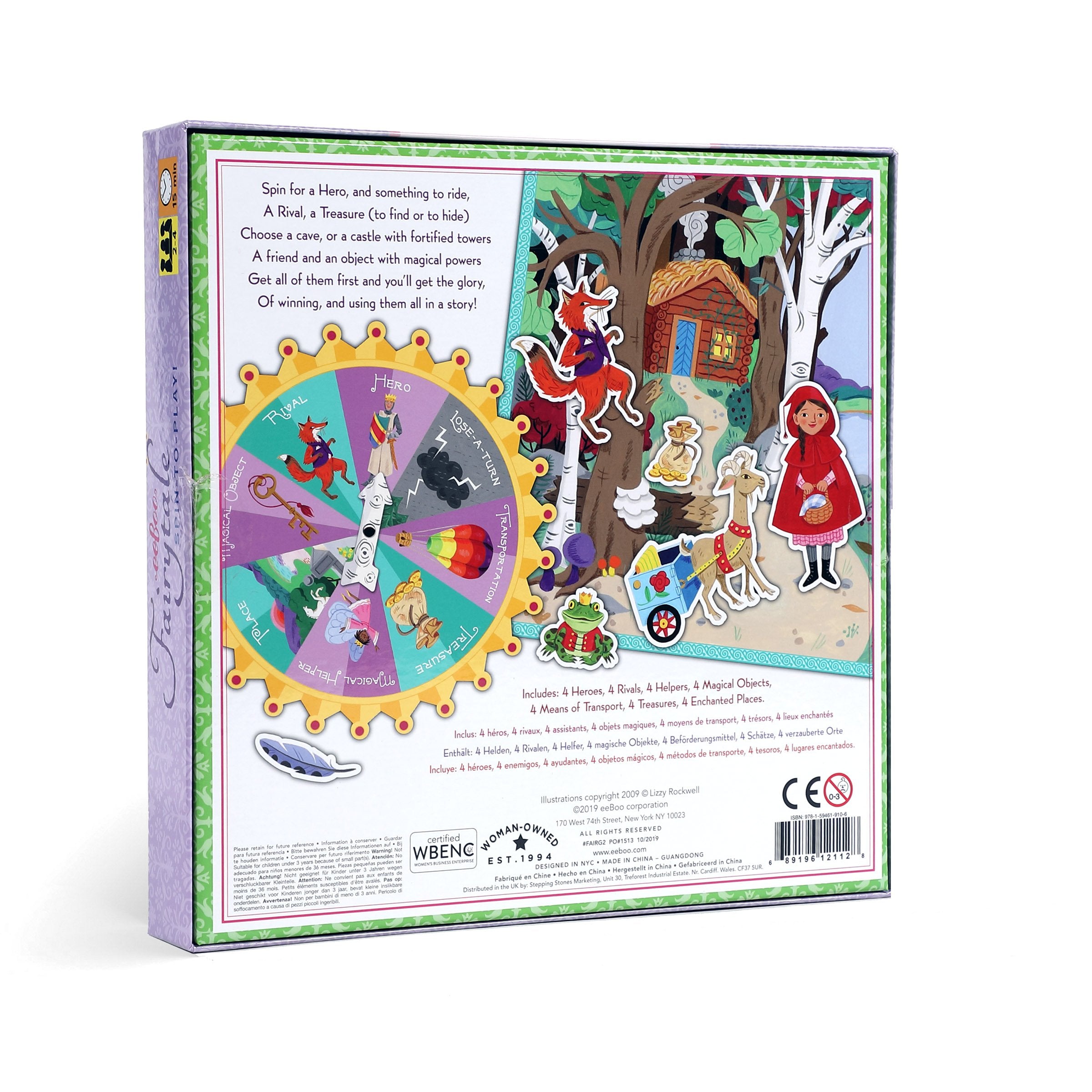 Players spin to select the elements for their fairy tale. When they have collected a scene, a hero, a magical helper, a rival, a magical object, transportation, and a treasure, they tell the tale that these elements evoke. Game extensions encourage compassion in suggesting using a misunderstood rival as a hero on occasion, and longer tales for two players. For 2 to 4 players
