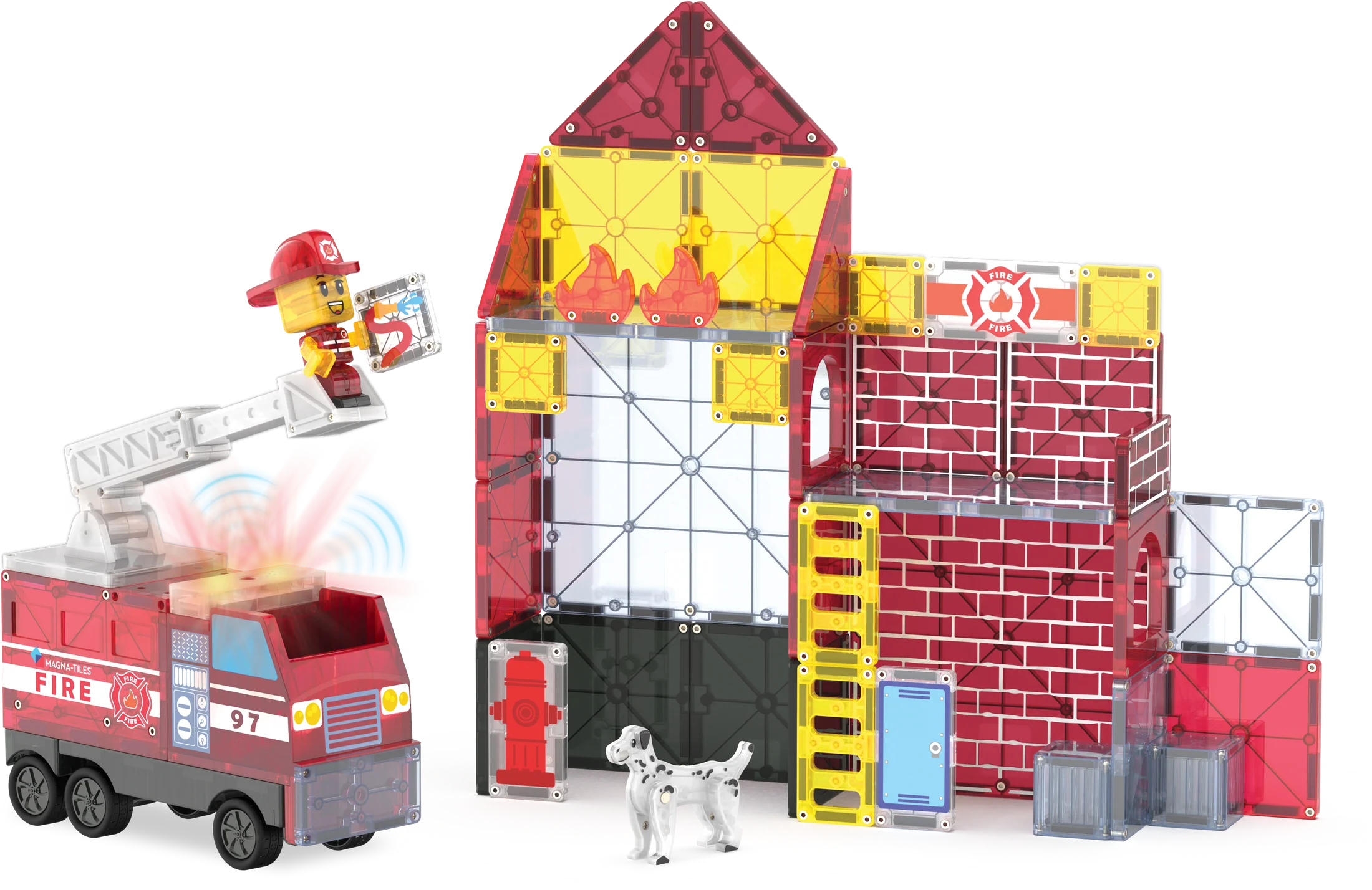 Step into action with the MAGNA-TILES Fire Station Set! Create custom rescue vehicles with the all-new modular Fire Truck, complete with an extendable ladder to tackle towering blazes. Bring playtime to life with the Light & Sound Tile, featuring flashing lights and a siren for an authentic firefighting experience. Complete with a Firefighter Figure and their trusty magnetic Dalmatian companion.
