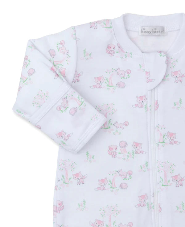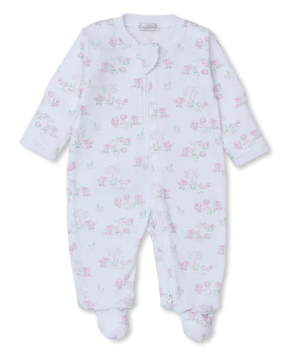 Playfully patterned with Kissy's forest fun pink print, this cozy zippered footie is perfect for your baby girl. Made from 100% Pima cotton for ultimate comfort and softness.