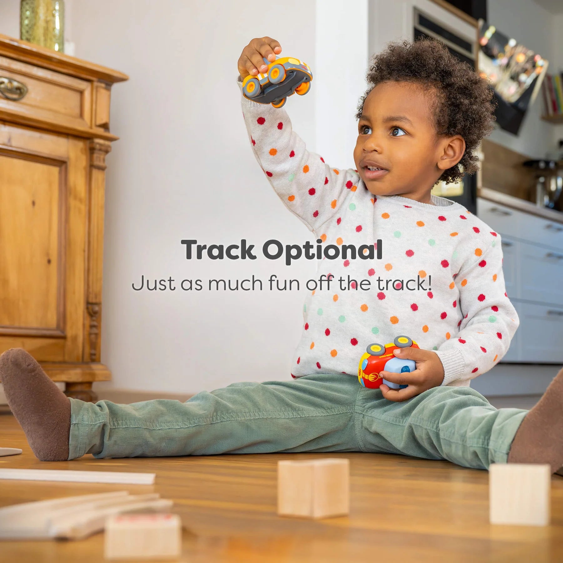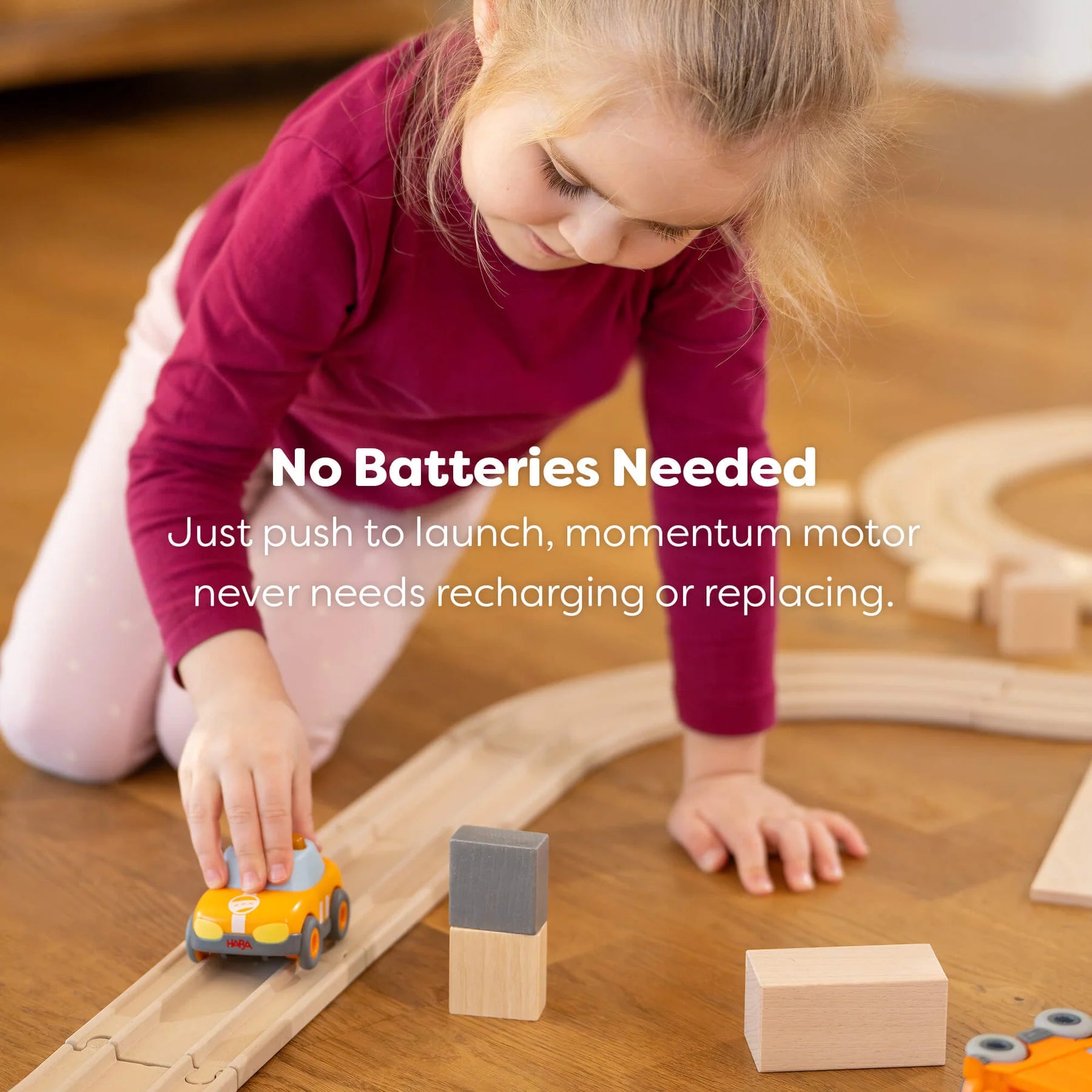 Leader of the pack! This sunny yellow pace car is the perfect front-runner for eco-conscious racers. Made from 100% recycled plastic and equipped with a momentum motor, it takes off with a gentle push, no batteries needed. Whether guiding a pack on a Kullerbü track or cruising across the floor, it keeps the race fun and Earth-friendly for toddlers 2 and up.