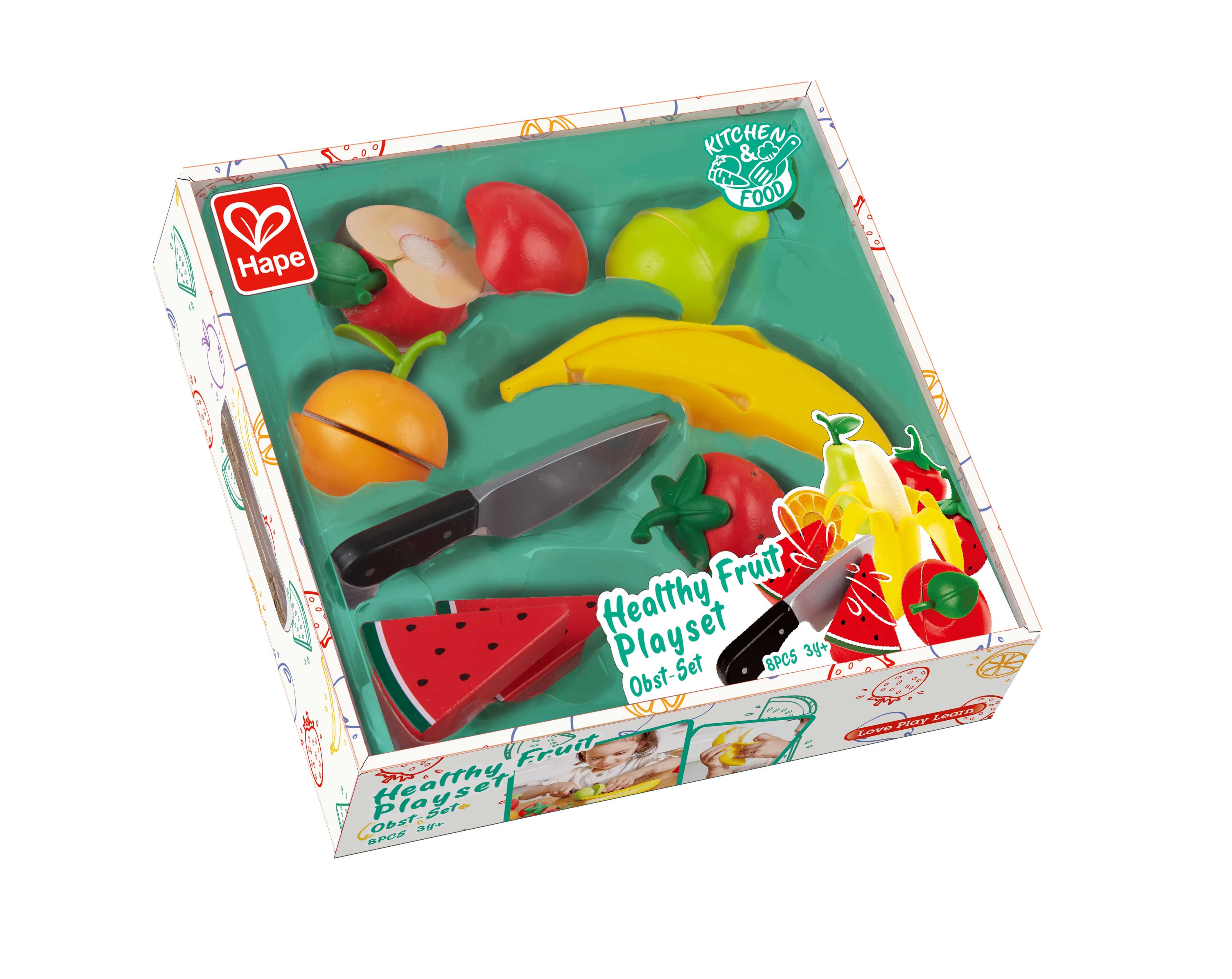 Get used to eating healthily with this cute fruit set. Includes one realistic play knife, two strawberries, one pear, one orange, one apple, with removable stalks and one slice of watermelon all of which can be sliced with the realistic play knife and one peelable banana.