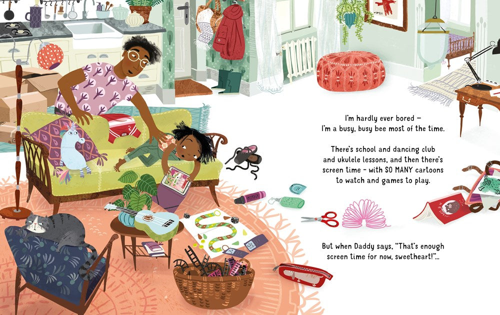 A wonderful story about a BORED little girl, deprived of screen time, who learns to have fun with her imagination.