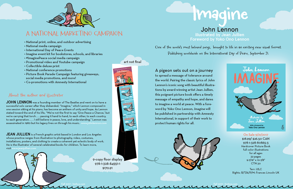 Join one little pigeon as she sets out on a journey to spread a message of tolerance around the world. Featuring the lyrics of John Lennon’s iconic song and illustrations by the award-winning artist Jean Jullien, this poignant and timely picture book dares to imagine a world at peace. Imagine will be published in partnership with human rights organization Amnesty International.