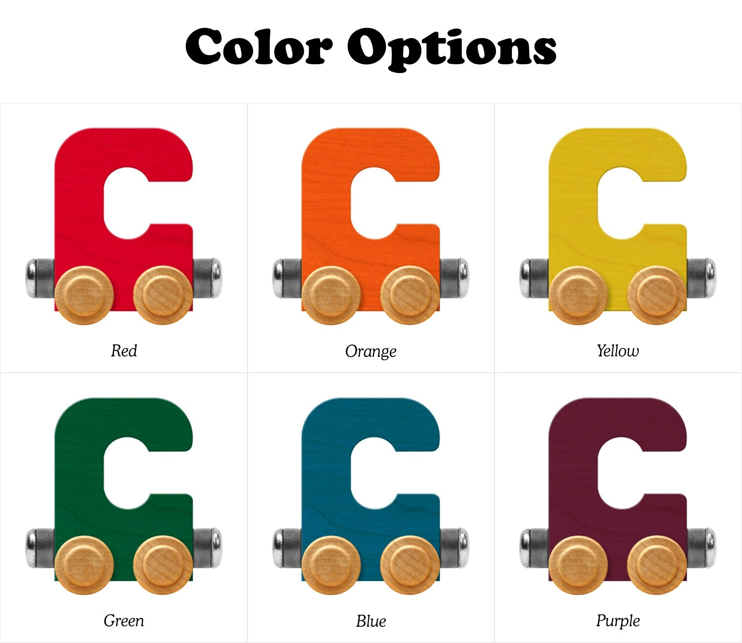 Each Bright Color NameTrains Letter Car is available in one of 6 colors: red, orange, yellow, green, blue, or purple.