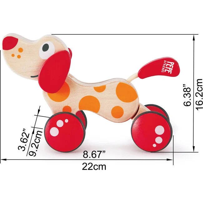 Features Pepe the Puppy in a fun pull-along style toy. Natural wood design with bright simple colors. Cheerful and ready to adventure with you! Encourages kids to imagine and create stories as they play.