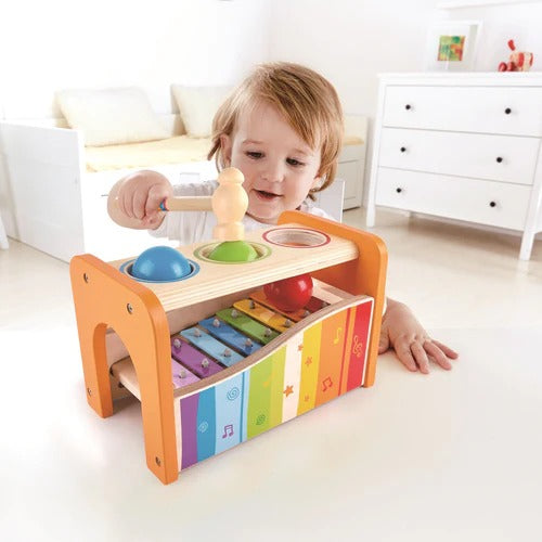 This kid xylophone can be played in a variety of ways. The kids can fetch balls as pounding sends the balls tinkling over or they can pull out the keyboard and xylophone and play a solo.