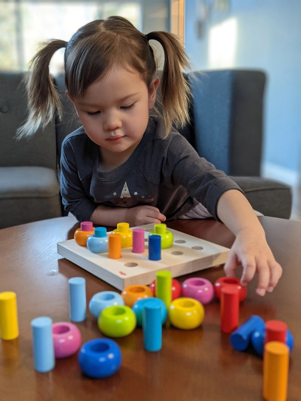 This solid wooden board holds 16 brightly colored wooden pegs and 16 rings that will engage toddlers and preschoolers in creative, imaginative play. Perfect for little hands, the pegs and rings easily plug into the sturdy board. Your little one will have many hours of fun stacking and sorting the rings and pegs, making tall towers or creating endless designs, while learning cognitive skills such as color recognition counting and patterning.
