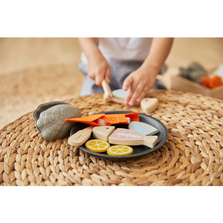 The set includes a variety of seafood and utensils to teach children the importance of preparatory work in the kitchen. It features 1 oyster, 1 prawn with a peel-away shell, 1 sliceable fish, 2 lemons, 1 oyster knife, 1 fillet knife, and 1 plate.