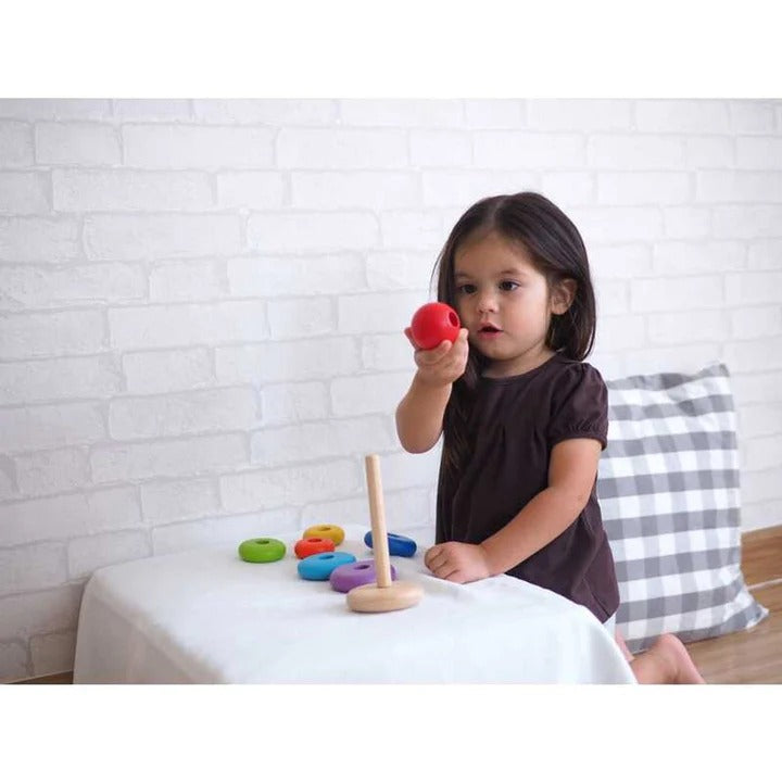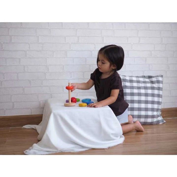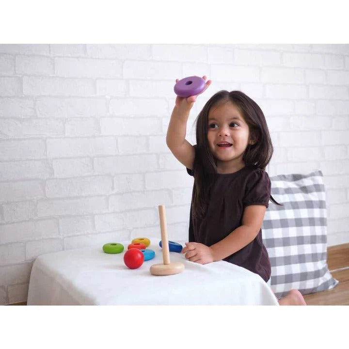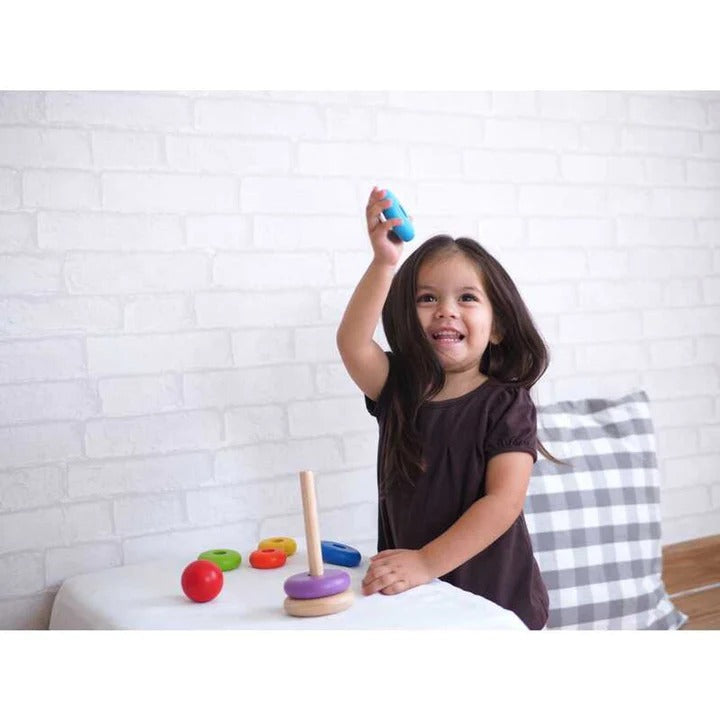 Improves fine motor skills and child's ability to stack, categorize, count and recognize various sizes of rings