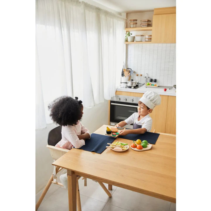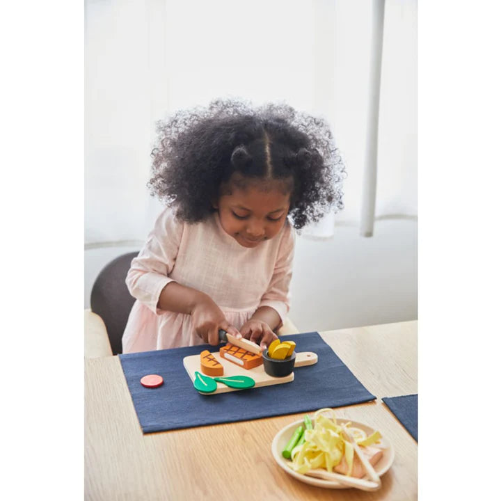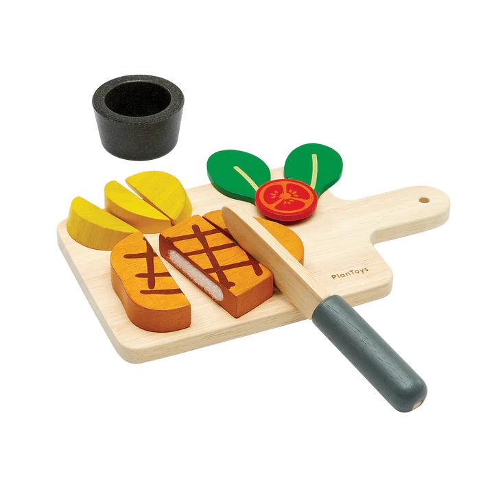 It’s important to teach children the benefits of a well-balanced meal. With this set, children can prepare a western-style steak for themselves or a guest. This set includes 1 halved tomato, 3 potato wedges, 2 slices of lettuce, 1 sauce cup, 1 knife, 1 slab of sliceable beef, and 1 cutting board. Encourage a young chef to develop an extensive menu by combining this set with other PlanToys pretend foods and kitchenware.
