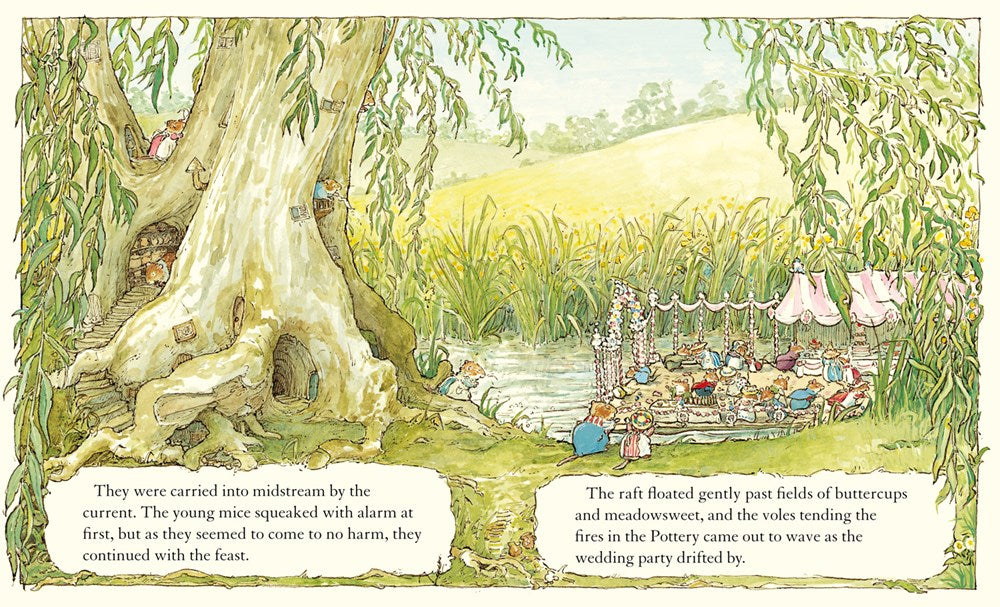 It was such a hot summer. They sky was deep blue and the sun never faltered. All along Brambly Hedge, the mice did their best to keep cool. Poppy Eyebright sought refuge in the mossy shadows of the mill wheel; Dusty Dogwood took to walking by the banks of the cooling stream. Dusty and Poppy spent more and more time together, so no one was at all surprised when they announced their engagement. They decided on a very unusual setting for the wedding ceremony, but even they didn’t realise just how unusual it was prove to be!