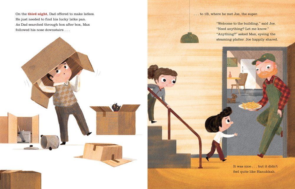 It’s Hanukkah, and Max and Rachel are excited to light the menorah in their family’s new apartment. But, unfortunately, their Hanukkah box is missing. So now they have no menorah, candles, dreidels, or, well, anything! Luckily, their neighbors are happy to help, offering thoughtful and often humorous stand-in items each night. And then, just as Hanukkah is about to end, Max and Rachel, inspired by the shamash (“helper”) candle, have a brilliant idea: they’re going to celebrate the Ninth Night of Hanukkah as a way to say thanks to everyone who’s helped them!