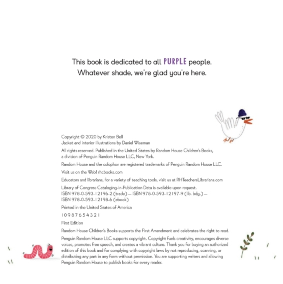 Looking to reach beyond the political divide of red and blue, Kristen Bell and Benjamin Hart have created a hilarious and joyous read-aloud that offers a wonderful message about embracing the things that bring us together as humans. This book will inspire a whole generation to paint the world purple!