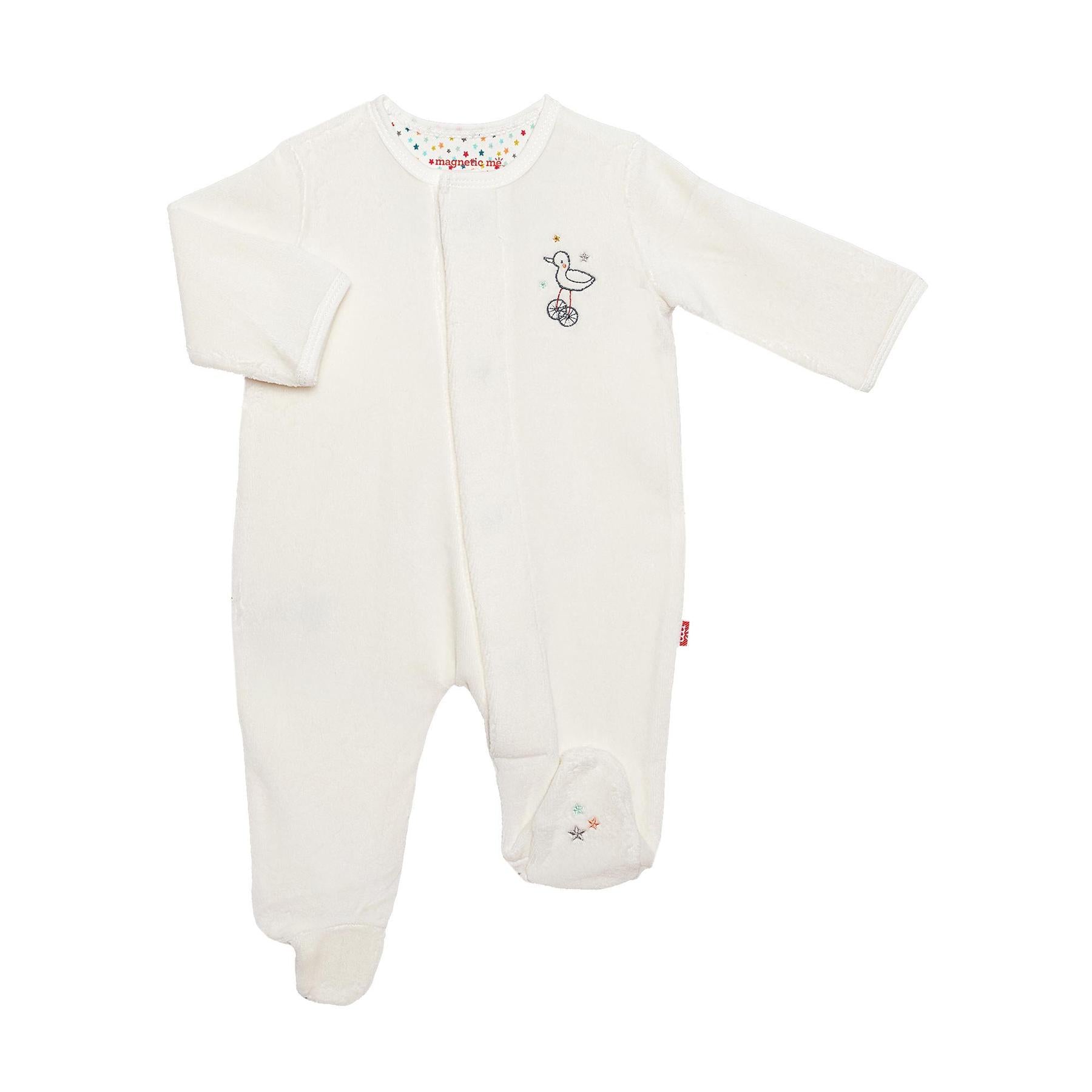 This magnetic footie, featuring time-saving magnetic fasteners and no over-the-head design, gets baby dressed faster than Clark Kent turns into Superman!